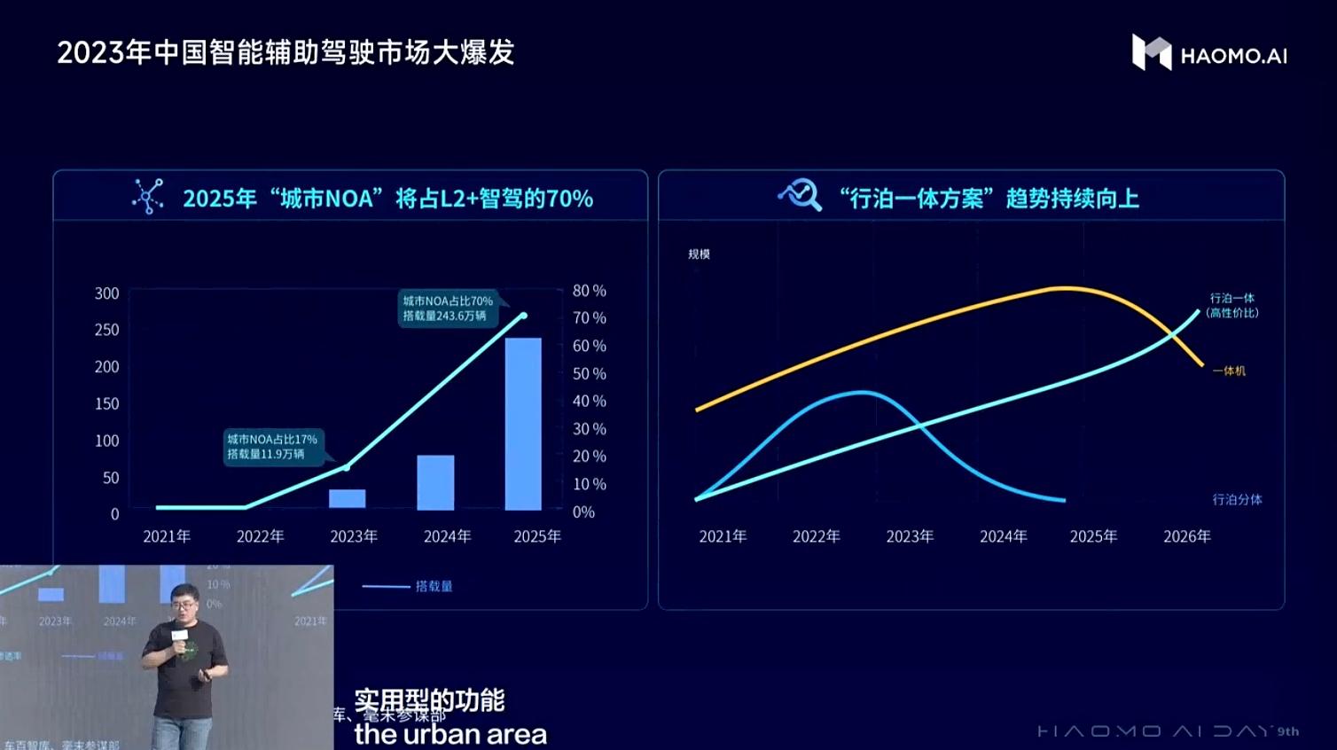 張凱介紹,目前乘用車銷量和智能化指數都在穩步提升,同時智能駕駛滲透率與價格卻呈反向增長,乘用車市場L2及以上智能駕駛滲透率達42.4%,2025年將達70%,並普及到10-20萬的主銷車型上;城市NOA迎來量產上車潮,目前佔L2及以上輔助駕駛份額的17%,2025年將達70%;行泊分體的硬件設計、一體機逐步退出市場,更具性價比的行泊一體的域控方案將成為主流。