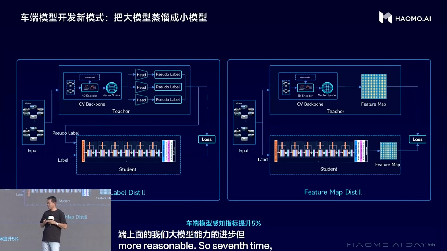 車端模型開發模式變革方面,毫末正在嘗試用蒸餾的方法,也就是用大模型輸出的偽標籤作為監督信號,讓車端小模型來學習雲端大模型的預測結果,或者通過對齊Feature Map的方式,讓車端小模型直接學習並對齊雲端的Feature Map,從而提升車端小模型的能力。基於蒸餾的方式,可以讓車端的感知效果提升五個百分點。