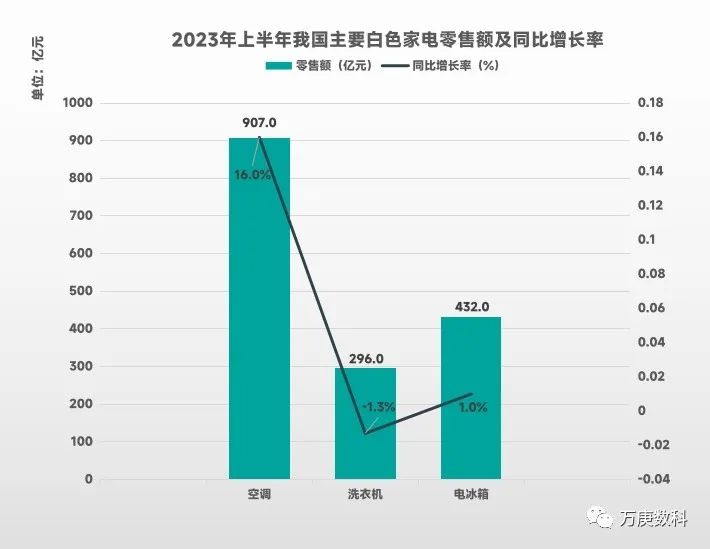 從2023年上半年我國白色家電主要三大品類空調、洗衣機、冰箱的產量來看,空調產量一騎絕塵,超1.4億台,高於洗衣機、冰箱產量之和,後兩者產量相近,都接近5000萬台大關。從三大品類的產量同比增長率來看,皆實現了較大增長,洗衣機產量增長率最高,達20.5%,空調、冰箱次之,分別為16.6%、13.3%,市場供給端持續發力。