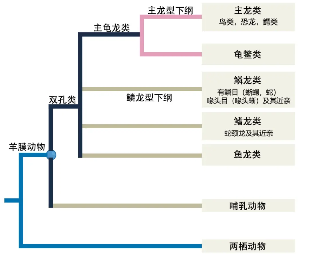 隨着時間的推移,我們的主角——羊膜動物登上了演化的大舞台。羊膜動物出現於約3.4億年前的石炭紀,從早期的兩棲類演化而來[7],包含下孔類(似哺乳爬行動物和哺乳動物)和爬行類(演化成龜鱉類、蜥蜴類、鱷類及鳥類)兩大主要的支系[8]。