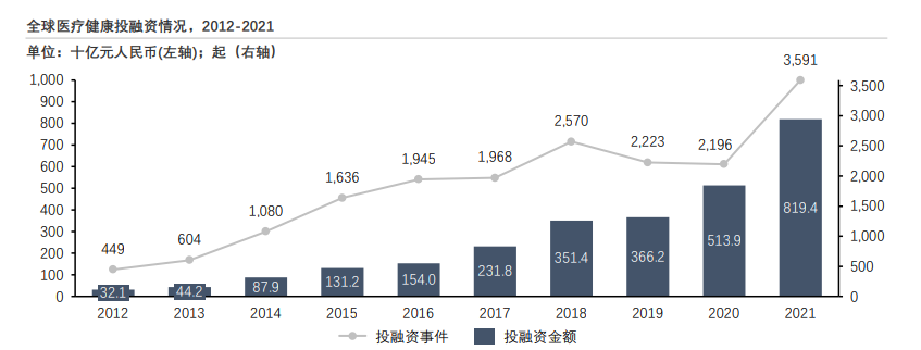 面對如此大的市場,從2021年開始,全球醫療健康領域發生了3591起融資,累計金額已達8194億元。全球醫藥市場保持了穩定增長的勢頭。