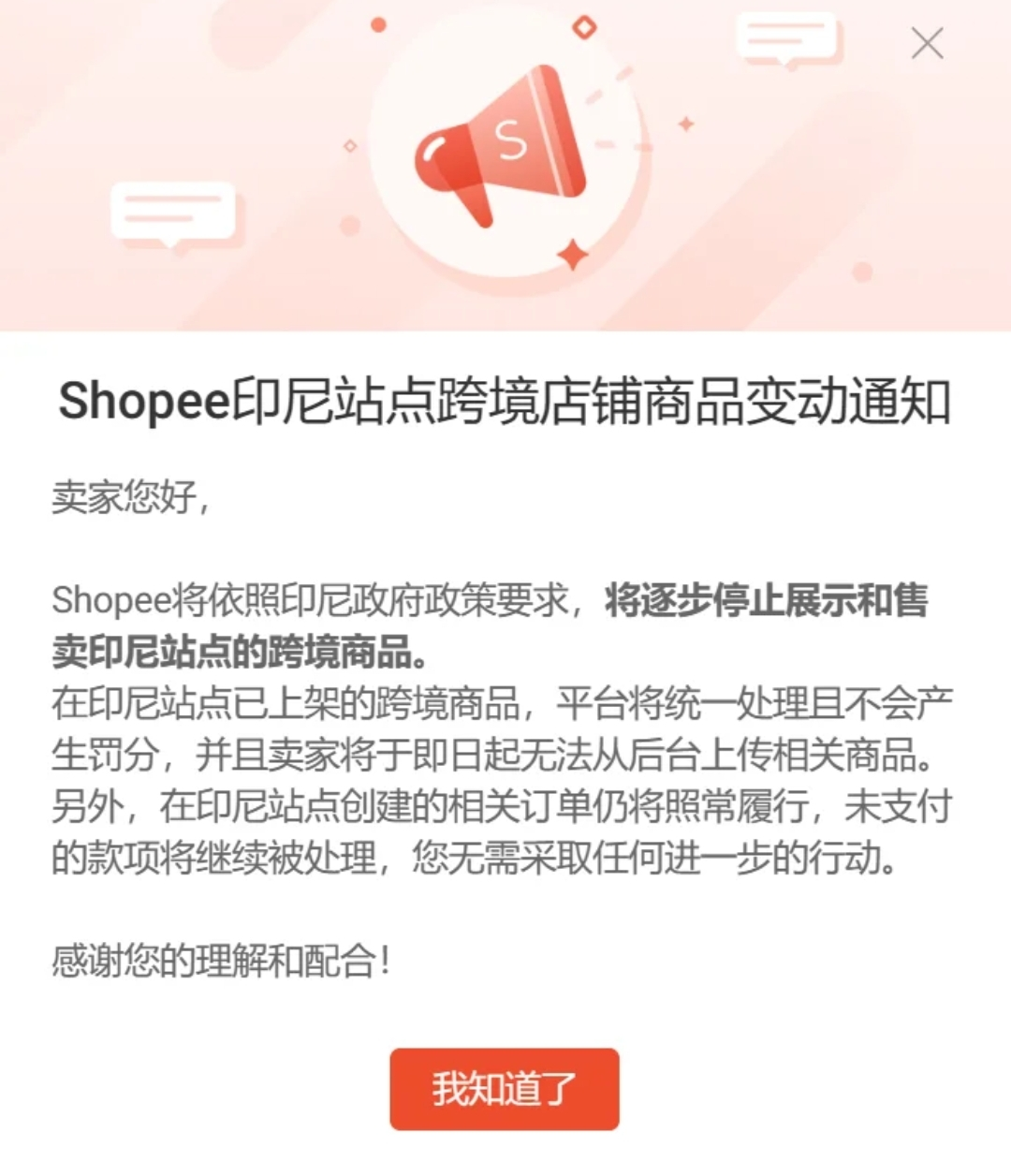 **一時間其他電商平台亦如驚弓之鳥般迅速做出反應。**Shopee隨即發出了“印尼站點跨境店鋪商品變動通知”,通知裏寫到Shopee將按照印尼政府政策要求,逐步停止展示和售賣印尼站點的跨境商品。此外,2023年12月31日前,Shopee印尼站的海外倉及第三方倉將全面停止向跨境賣家開放。Lazada方面則是發佈通知稱即日起將下架與印尼最新政策相沖突的全部商品。