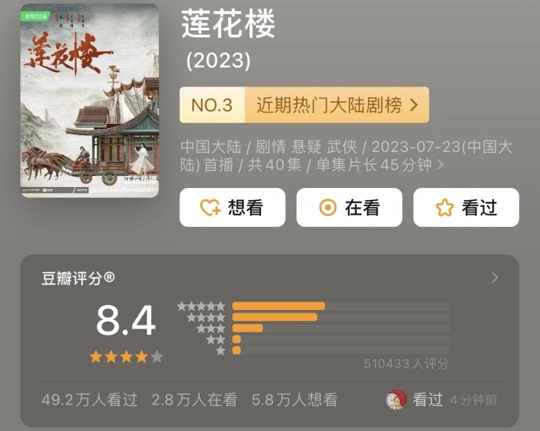 不僅如此,《蓮花樓》還憑藉豆瓣8.4的高分(甚至劇播完了之後評分還在節節攀升),一舉拿下暑期檔主流賽道最高評分劇。
