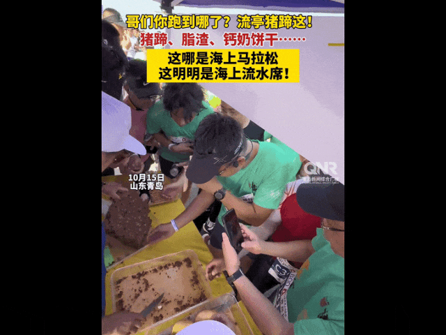 據介紹,這次青島海上馬拉松準備了500斤脱骨青島流亭豬蹄,6萬隻鐵板燒青島大蝦,直徑超60釐米的大饅頭,等等。