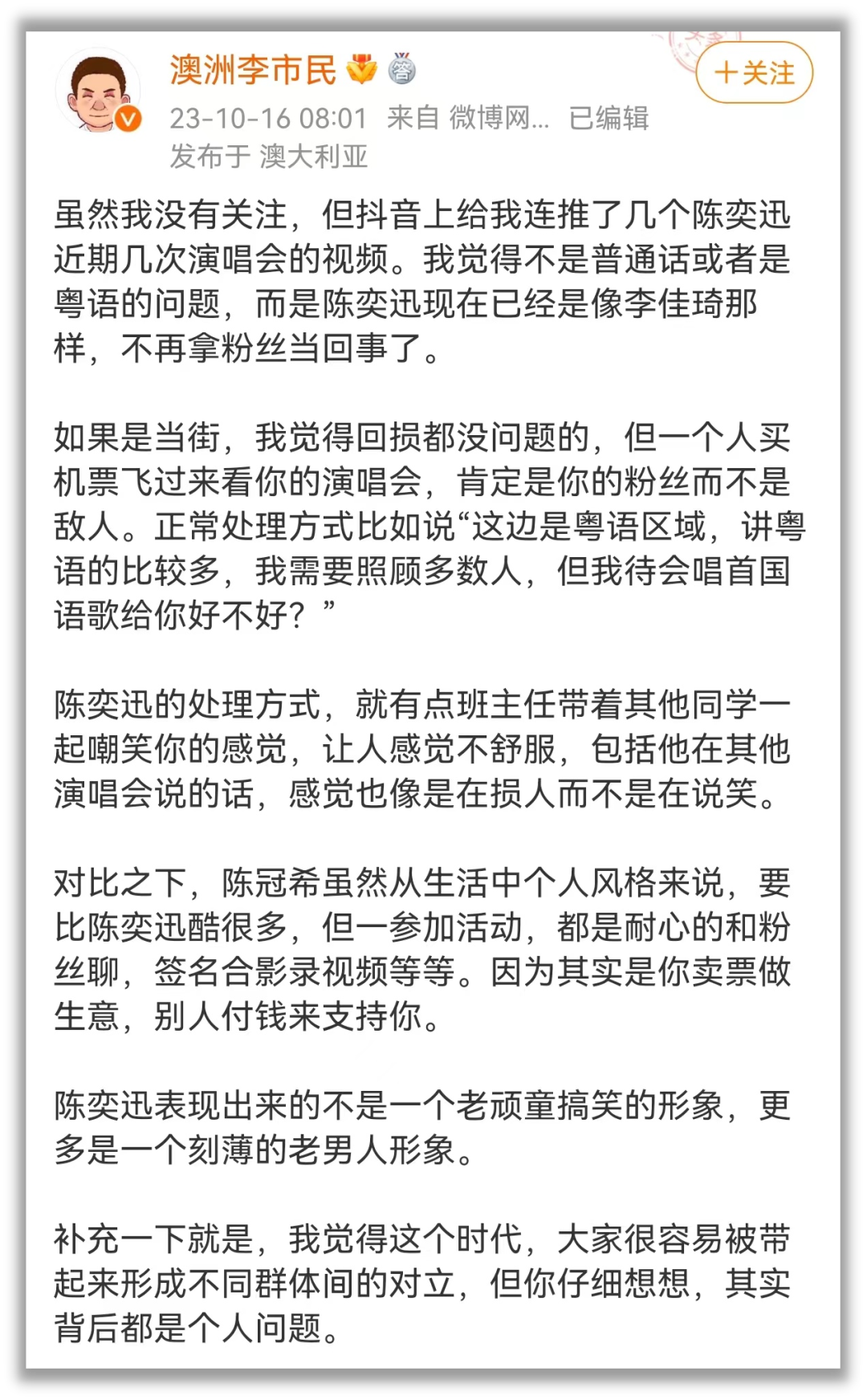 退一步説,即使粉絲確實做得不妥,陳先生又何必扭捏作態,教他們做人呢?