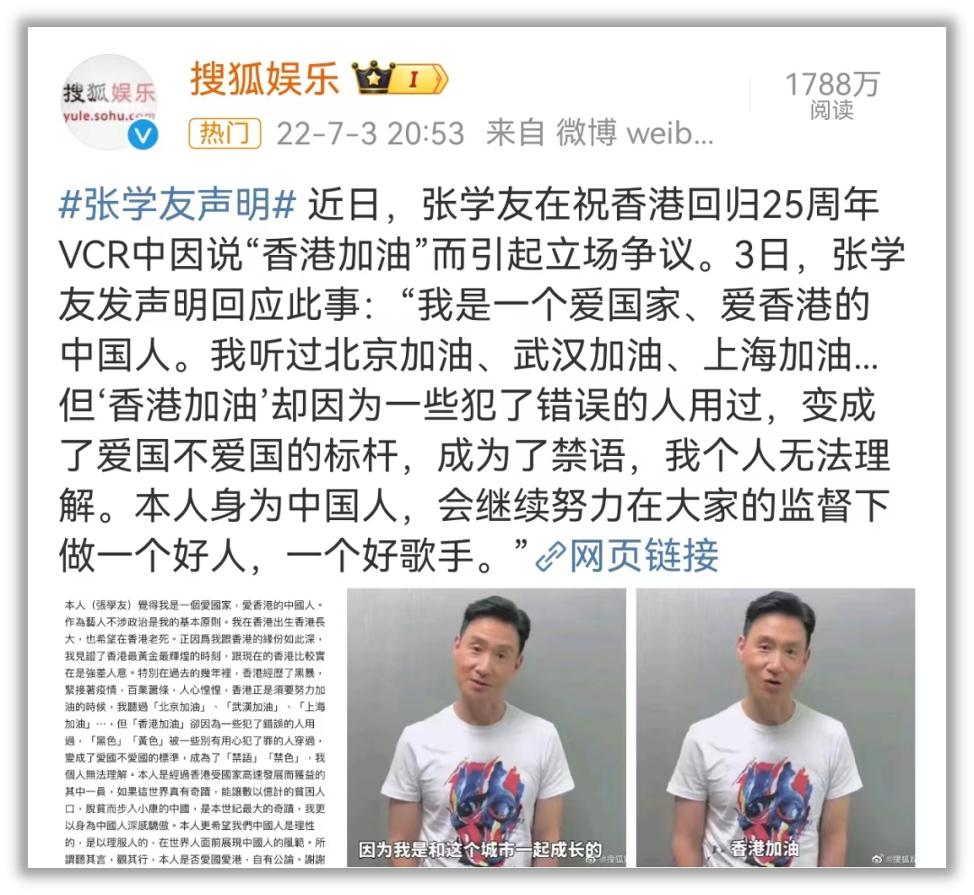 就在去年,張學友因為喊了一句“香港加油”就被人質疑政治立場,認為他涉嫌“港獨”。