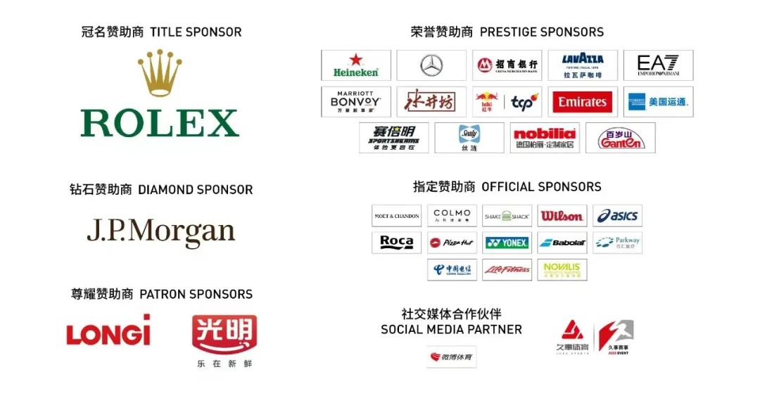 在今年的比賽中,上海大師賽的贊助級別分為冠名贊助商、鑽石贊助商、尊耀贊助商、榮譽贊助商以及指定贊助商五個級別,共囊括了31家品牌。必須指出的是,這31家品牌大都處於其所屬類別的頭部領域。因此不論是從贊助商的數量還是質量而言,上海大師賽都在ATP的賽事體系中名列前茅。