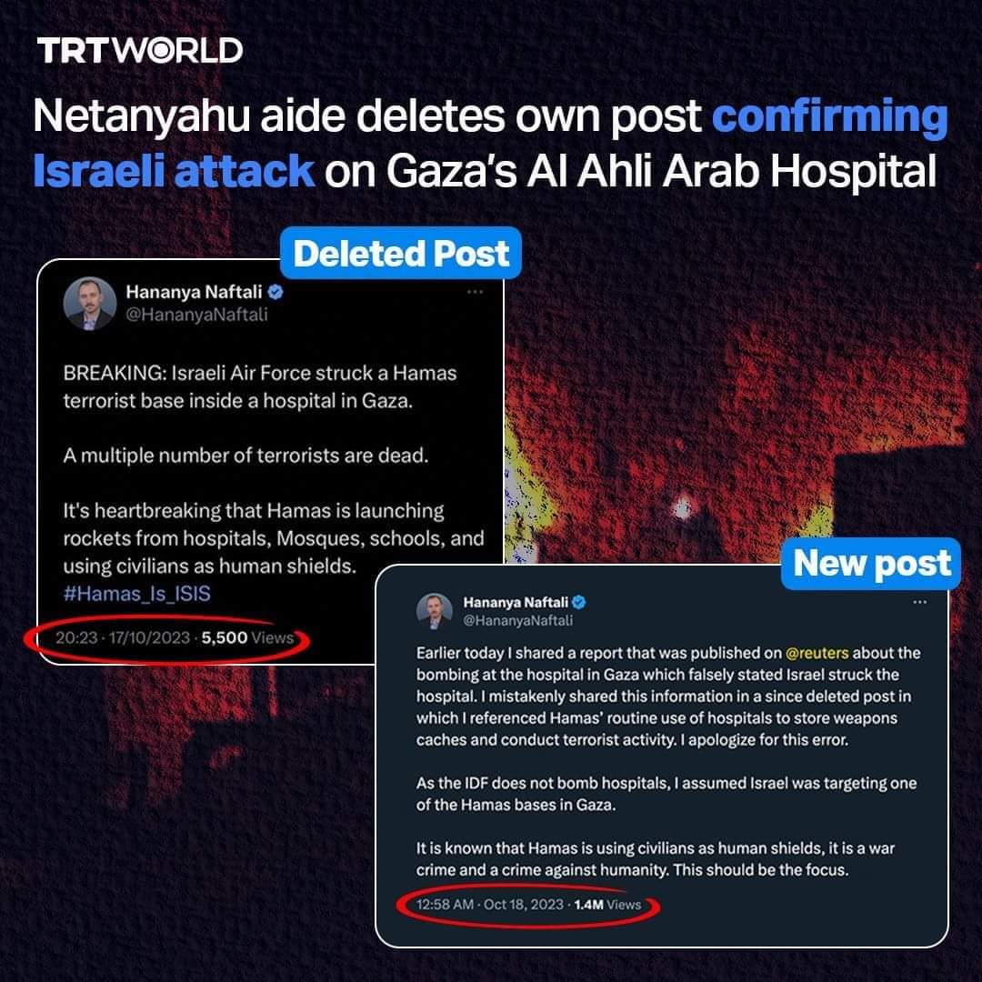 以色列政府的網上發言人哈南亞·納夫塔裏立刻發推,聲稱以軍擊中一處哈馬斯有意設在醫院裏的“恐怖基地”,多名“恐怖分子”喪生。但馬上匆匆刪帖,4.5小時後,重貼時聲明前面是錯發,以軍重來不攻擊醫院。