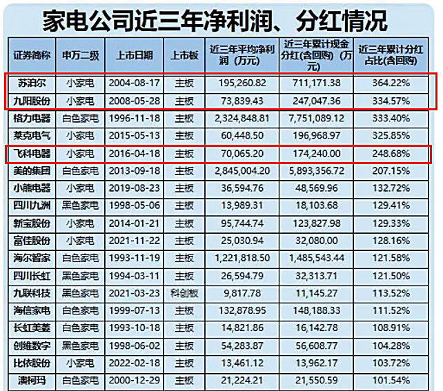 其中,蘇泊爾是唯一的小家電企業,且累計分紅上百億。Wind數據顯示,蘇泊爾上市以來累計分紅113.28億元,股利支付率高達69.49%。(編者按:“股利支付率”是指上市公司向股東分派的股息佔公司盈利的百分比,即股利支付率=股利總額÷淨利潤總額×100%)