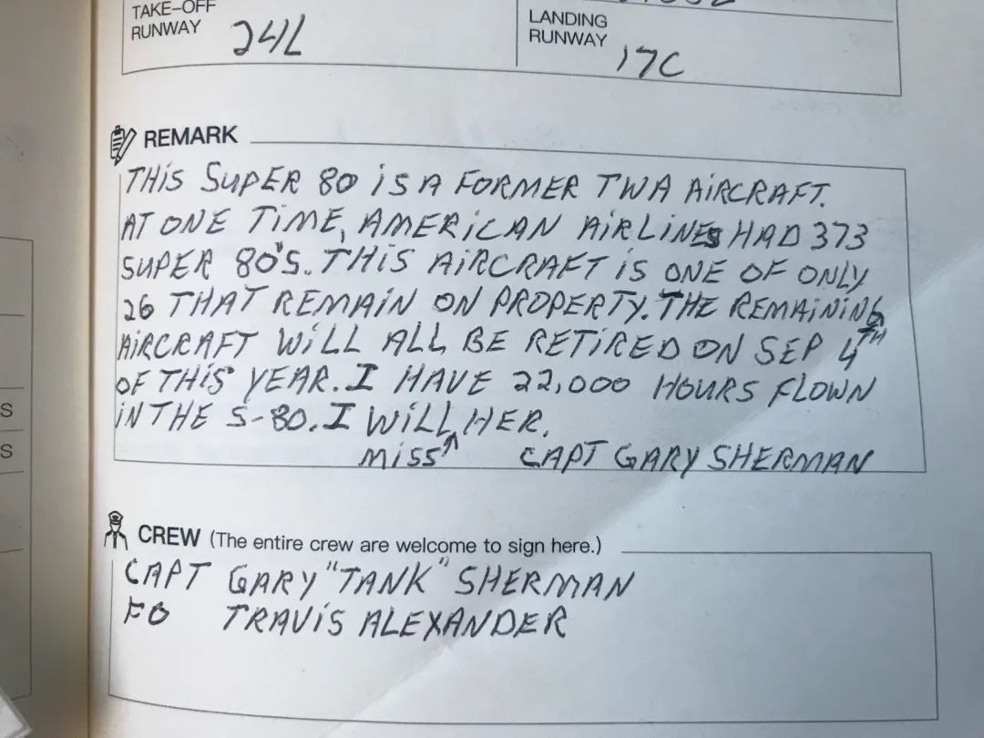 “這架Super 80此前隸屬TWA環球航空,美國航空一度曾擁有多達373架Super 80,而這架飛機是目前還在運營的26架之一,它們都將在(2019年)9月4日全部退役。我在Super 80上共飛行了22000小時,I will miss her. —Gary Sherman”