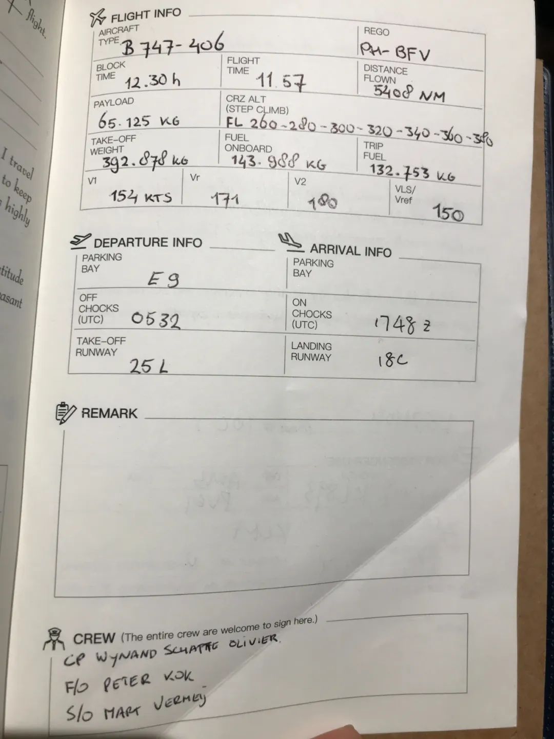 疫情前,好友乘坐荷蘭皇家航空波音747-Combi型飛機,當《飛行日誌》送進駕駛艙後,兩位飛行員特別欣喜,落地後把好友請到駕駛艙閒聊,機長説:**“今天這個航班,是我最後一次執飛波音747飛機。”**並在日誌上籤下了名字。