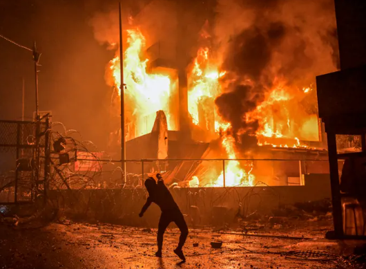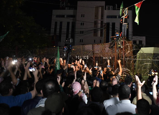 18日,數百名抗議者聚集在美國駐黎巴嫩大使館外,人們激動地揮舞着巴勒斯坦的國旗,甚至爬上了鐵絲網頂部的圍欄。示威者在大使館外與安保人員發生衝突,向使館投擲石塊並縱火。