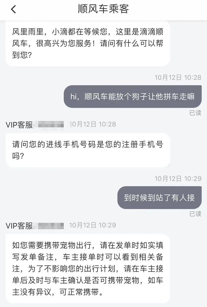 例如,滴滴客服表示:如您需要攜帶寵物出行,請在發單時如實填寫發單備註,車主接單時可以看到相關備註,為了不影響您的出行計劃,請在車主接單後及時與車主確認是否可攜帶寵物,如車主沒有異議,可正常攜帶。