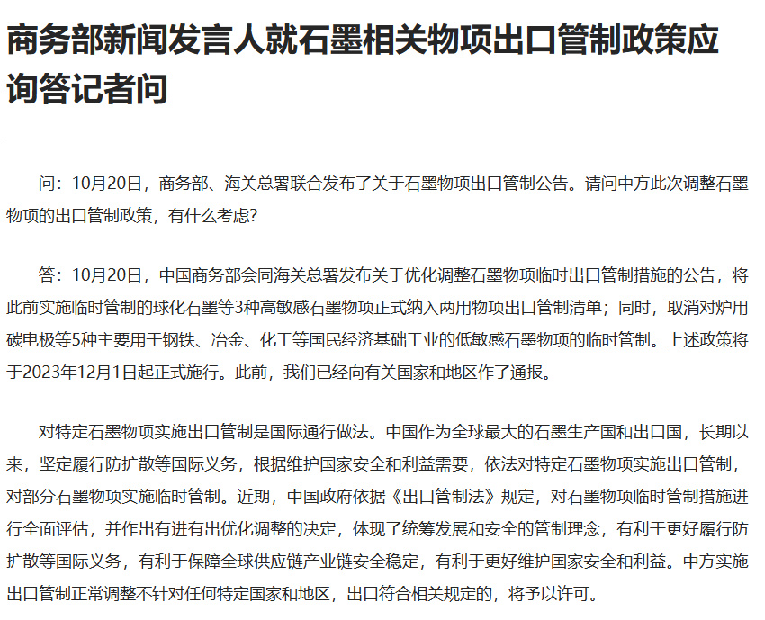 高純度(純度>99.9%)、高強度(抗折強度>30Mpa)、高密度(密度>1.73克/立方厘米)的人造石墨材料及其製品,以及天然鱗片石墨及其製品(包含球化石墨、膨脹石墨等),未經許可,不得出口,並將於2023年12月1日施行。