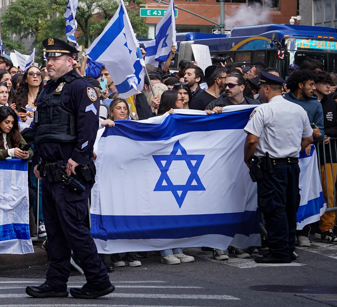 一街之隔,揮舞着藍白相間國旗的以色列支持者也表達了他們的立場。