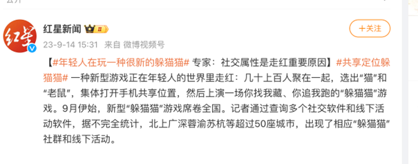 (據紅星新聞:9月伊始,新型“躲貓貓”遊戲席捲全國,據不完全統計,北上廣深蓉渝蘇杭等超過50 座城市)