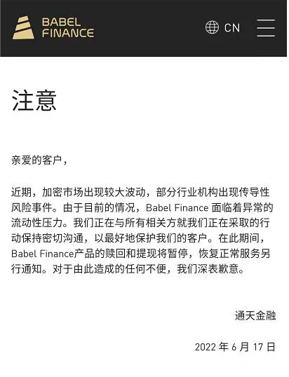 2022年6月17日,總部位於香港的數字貨幣貸款公司貝寶(Babel Finance)宣佈因“異常的流動性危機”,暫停產品贖回和提幣。“吳説區塊鏈”曾報道稱,貝寶的核心模式,就是以低成本吸納資金,再加槓桿購買比特幣,而其自有資金與客户資金無法完全分開。