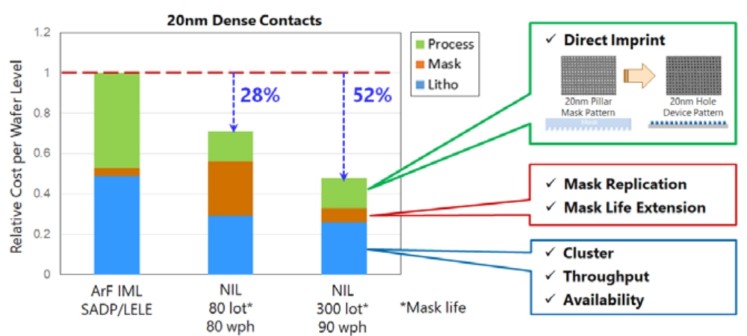 對比之下,用納米壓印技術可以省掉將近三成的成本,要是晶圓吞吐量再提升一點,直接就能節省一大半的成本。