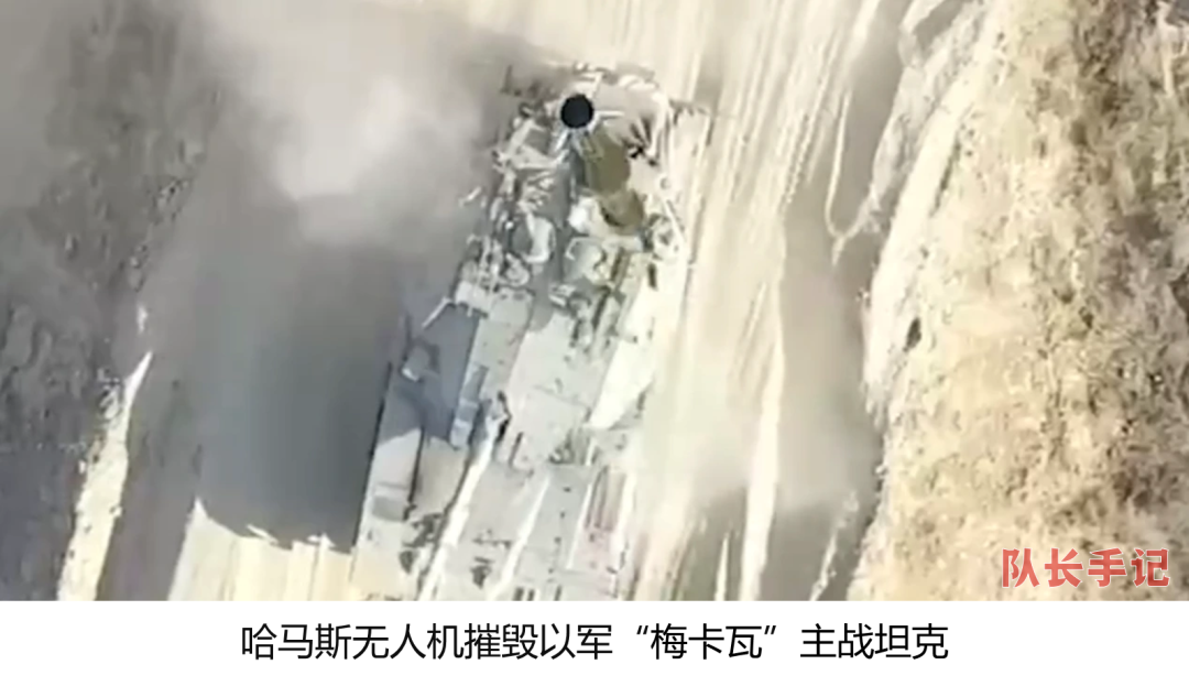 在無人機沒有氾濫之前,梅卡瓦坦克堪稱中東一霸。可當無人機出現以後,對坦克的“攻頂打擊”就成為了家常便飯。所以我們可以看到,哈馬斯用無人機投擲RPG炮彈,對梅卡瓦實施拱頂打擊,幾乎一發就能幹掉一輛梅卡瓦!