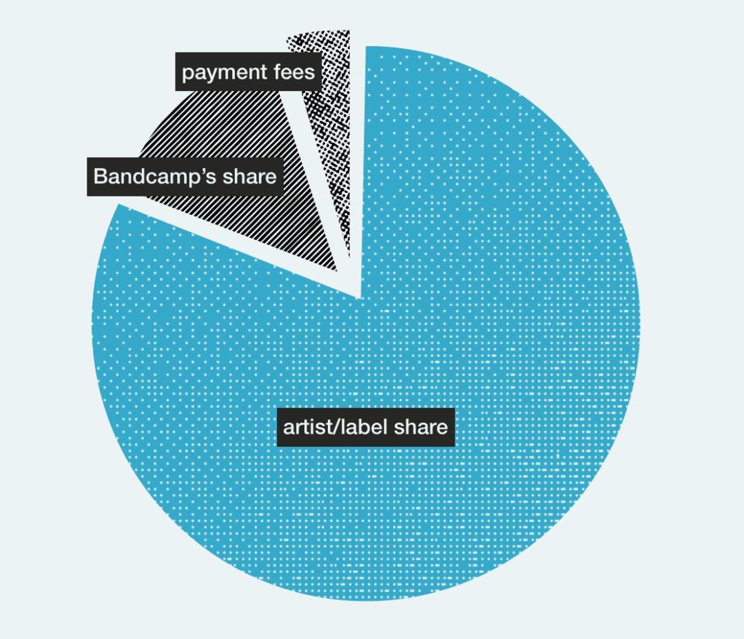 成立之初,Bandcamp就打出了“只在音樂人賺錢之後盈利”的口號,並在2010年開始採用其標誌性的收入分成模式:**平台從音樂人的作品銷售中抽取佣金,數字作品抽15%,實體作品抽10%,當音樂人的歷史銷售額超過5000美元時,數字銷售佣金降為10%。**抽完佣金後,剩餘全部金額(平均約82%)通常會在24-48小時內通過支付軟件直接流向創作者。