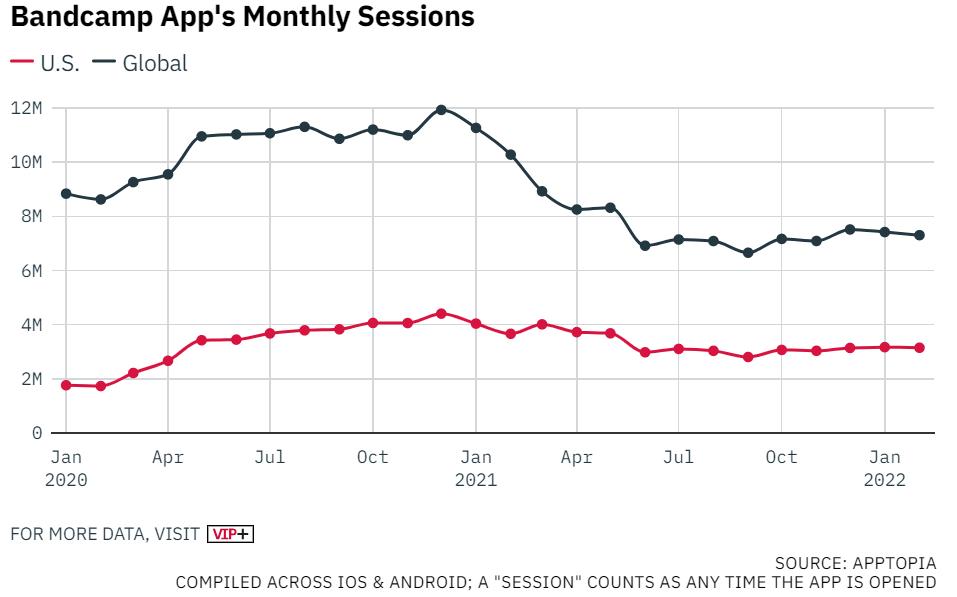 據美國市場研究公司Apptopia報道,Bandcamp App的全球使用量和美國國內使用量在2020年12月開始十分明顯地由漲轉跌,從2021年6月開始,Bandcamp App的月活停止了下跌,但在此後的幾個月裏也不再增長,一直維持在700萬左右,不到其巔峯狀態的70%,甚至低於其2020 年 3 月之前的水平。