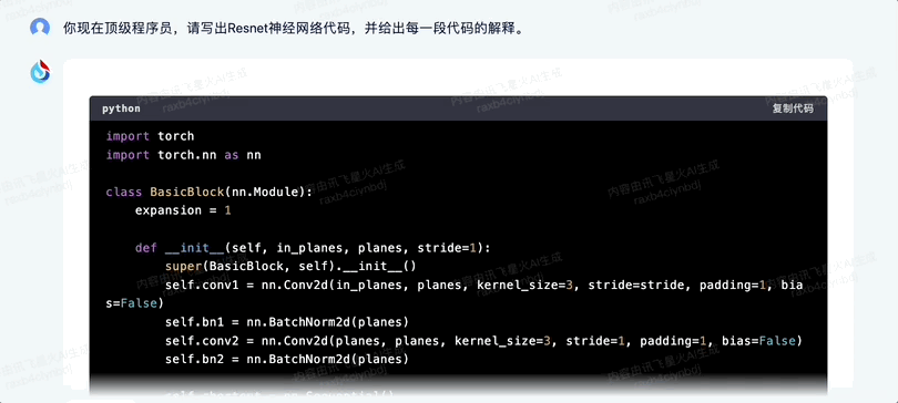 訊飛星火的回答直接分成了代碼部分和解讀部分。