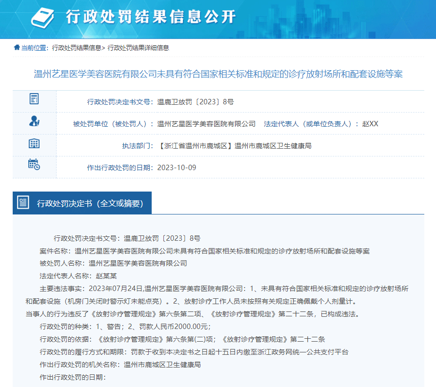 與此同時,公開信息顯示,2023年,温州藝星醫學美容醫院有限公司受到温州市鹿城區衞生健康局處罰,出發原因為操作不當。難以把控的安全問題,成為藝星們發展的“硬傷”。