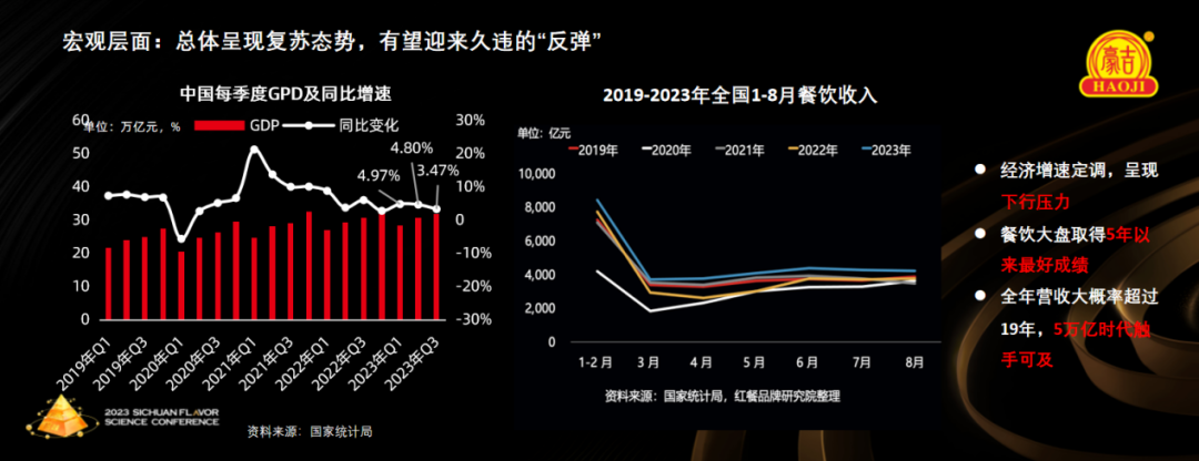 紅餐網聯合創始人、紅餐品牌研究院院長樊寧介紹道,2023年,在我國着力拉動內需政策的助力下,國內經濟逐步復甦,餐飲消費盡顯活力。據國家統計局數據,2023年第三季度,我國國內生產總值達到32.0萬億元,同比增長3.47%;2023年1-8月全國餐飲收入達到了32818億元,同比增長19.4%。