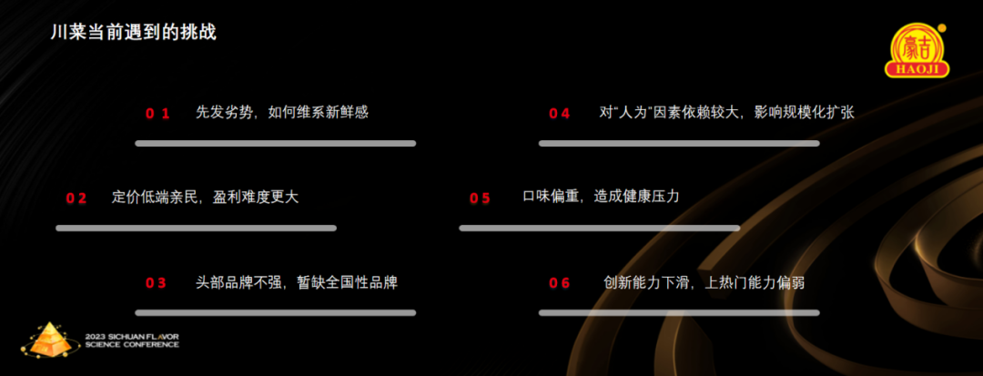 樊寧提到,時至今日,川菜品牌走向全國,川菜也在消費者的心中建立了較強的認知。但川菜這一品類的發展仍然存在六大挑戰:先發劣勢、盈利難度大、頭部品牌不強、規模化擴張受限、口味偏重、創新能力下滑等。