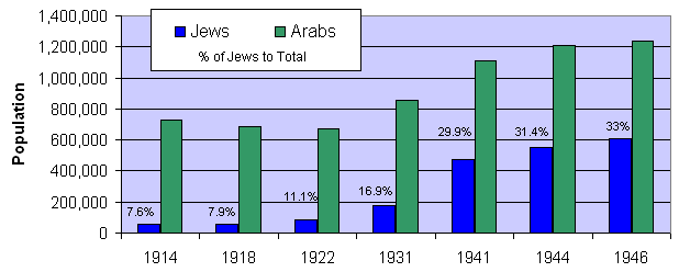 自從135年以色列人被大驅逐之後,羅馬人、希臘人和波斯人先後定居在這裏,但是自從7世紀中期之後,這裏絕大多數時間(除了十字軍東征的百年)的人口主流是阿拉伯人。按照1878年的奧斯曼帝國的第一次人口普查,這裏有約有47萬人,屬於中東人口稠密地區(偌大的沙特阿拉伯1900年才有214萬人),其中阿拉伯人數量為40.4萬,佔總人口的86%,而定居的猶太人(多數是1830年代之後的新移民)只有15011人。