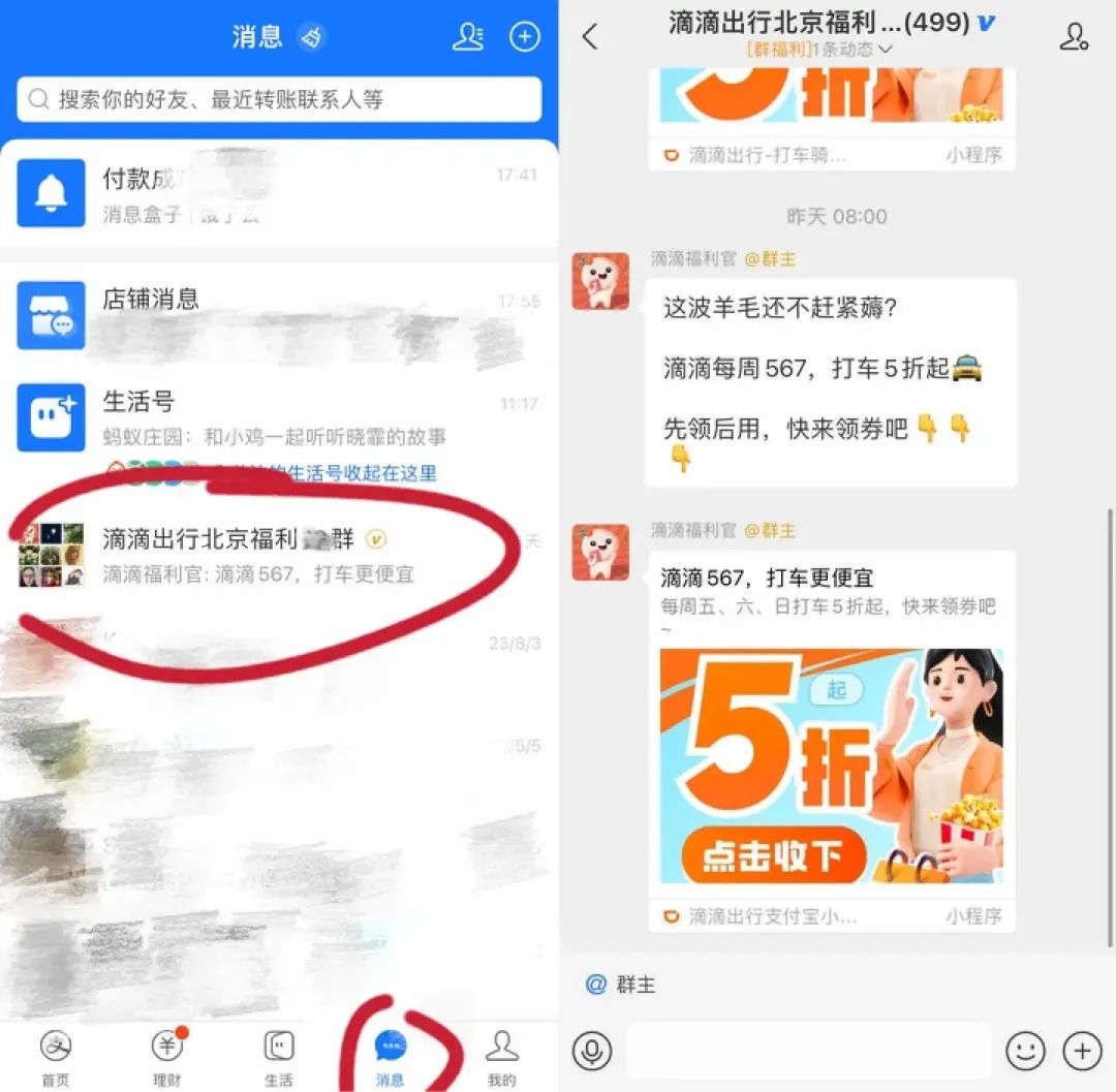 但對比來看,“支付寶的滴滴營銷羣雖然有490多個人,但活躍度還不如我微信那個140多個人的滴滴營銷羣。”蔡菜直言,“我10月21日進入支付寶滴滴營銷羣后,幾天裏僅滴滴工作人員發了一次營銷鏈接,而微信營銷羣裏,除了工作人員,還有用户會發鏈接讓羣友幫忙點擊之類的。”