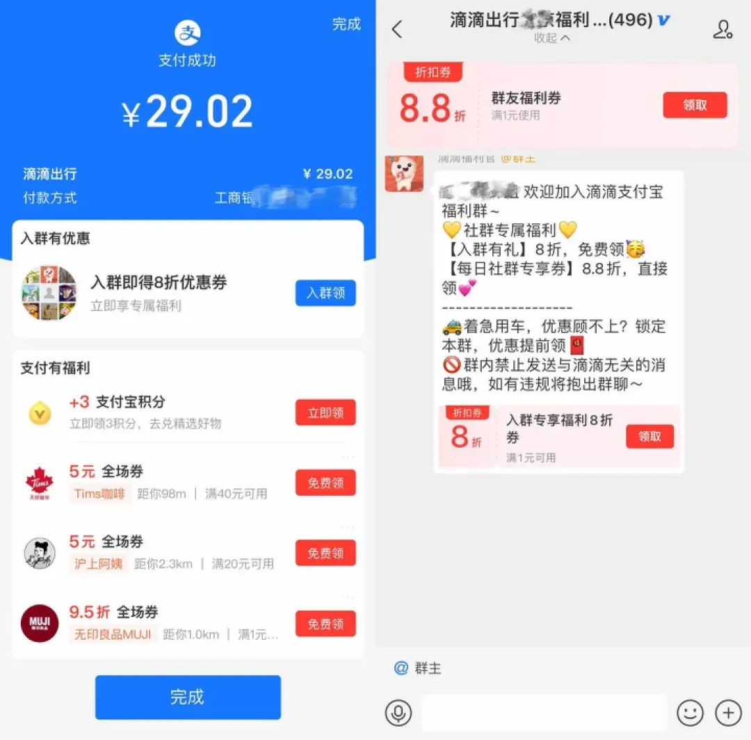 近期,蔡菜在使用支付寶為滴滴打車訂單付款時發現,“付完款,支付寶頁面出現了一個‘入羣有優惠’的提示,可以加入滴滴的支付寶福利羣,有優惠券可以領。”