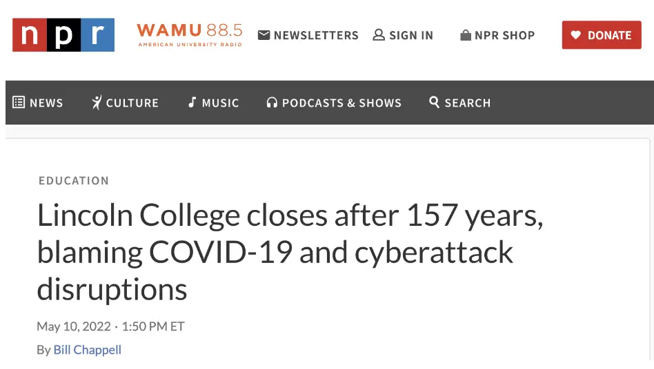 比如2022年5月,已經有157年曆史的伊利諾伊州林肯學院(Lincoln college)宣佈關閉: