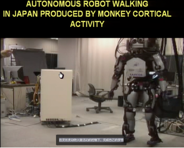 通過腦機接口,這隻位於美國的猴子,它的大腦信號通過高速網絡傳輸給了日本的一台機器人,機器人有樣學樣地模仿它行走,日本的錄像實時回傳給艾多亞觀看。