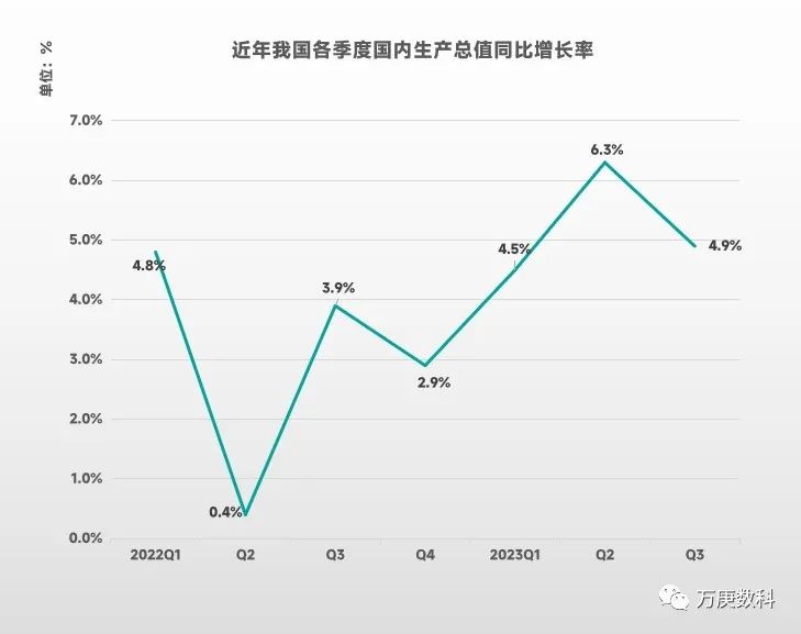 2023年以來,面對國內經濟復甦的艱鉅任務和國外動盪多變的複雜形勢,我國國民經濟經歷着陣痛調整下的穩步發展,以擴大內需為基調的一系列政策逐步使市場積極因素增多。據國家統計局數據,今年前三季度我國國內生產總值913027億元,按不變價格計算,同比增長5.2%。加之去年四季度為2.9%的低基數,不出意外,今年四季度能夠延續三季度的良好走勢、實現穩定增長。而據統計局初步測算,四季度只要增長4.4%以上,就可以保障完成全年5%左右的預期目標。