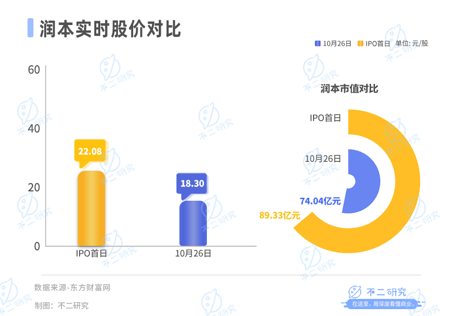 上市後8個交易日,截至10月26日A股收盤,潤本報收18.30元/股,對應市值73.60億元;與IPO首日相比,其市值蒸發15.29億元。