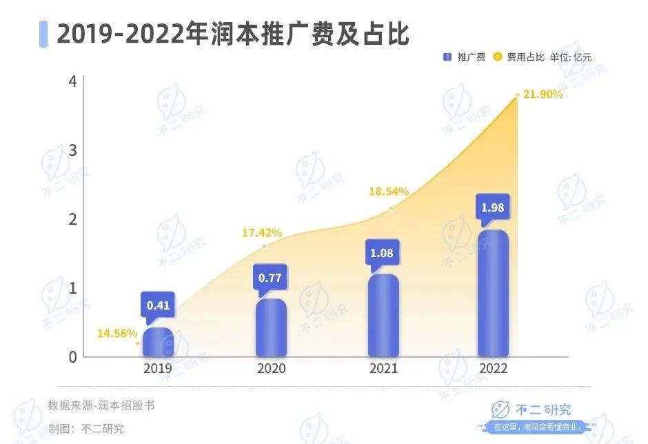 招股書顯示,潤本向電商平台支付的流量推廣、平台佣金以及技術服務等費用逐年攀升。招股書顯示,2019-2022年,潤本的推廣費分別為0.41億元、0.77億元、1.08億元和1.87億元,佔營業收入的比例分別為14.56%、17.42%、18.54%和21.90%,佔比逐年提升。