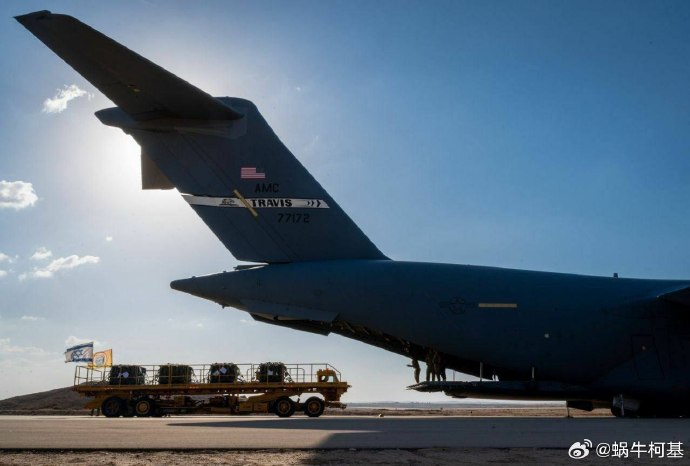 美國空軍C-17降落在以色列,據説攜帶的是155毫米炮彈,從德國拉姆施泰因空軍基地裝載,在以色列內瓦蒂姆空軍基地卸載。