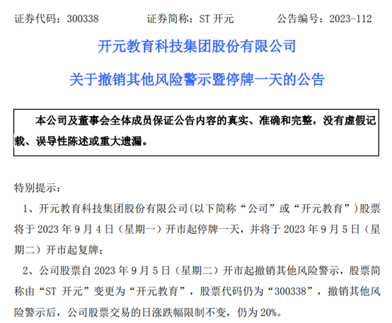 9月1日,開元教育公告,公司股票將於9月4日開市起停牌一天,並將於9月5日開市起復牌,並撤銷其他風險警示,股票簡稱由“ST開元”變更為“開元教育”。