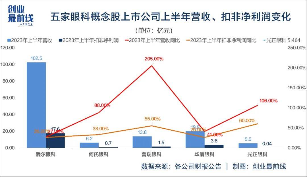 光正眼科業績的增長主要來源於2023年上半年的突出表現,其營收、扣非淨利潤增速分別為60%、106%。
