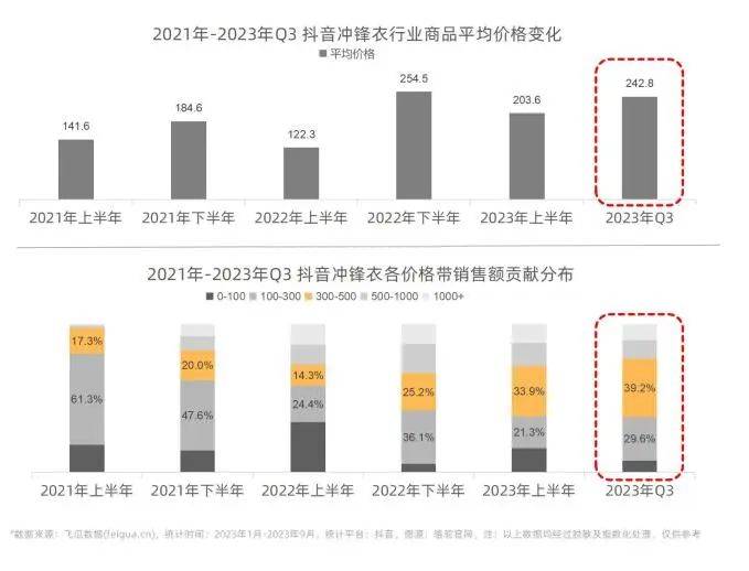 1、2021年-2022年,抖音衝鋒衣銷售額貢獻最大的價格區間是100-300,到2023年,則是300-500元是主流價格區間,佔市場規模的39.2%。