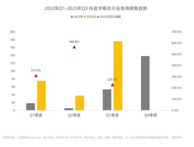 2、2023年Q1-Q3,抖音衝鋒衣市場銷售額每個季度同比增長均超過200%;