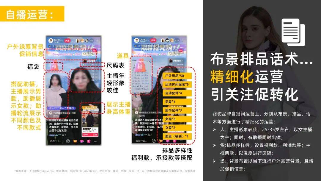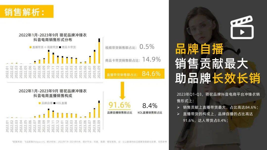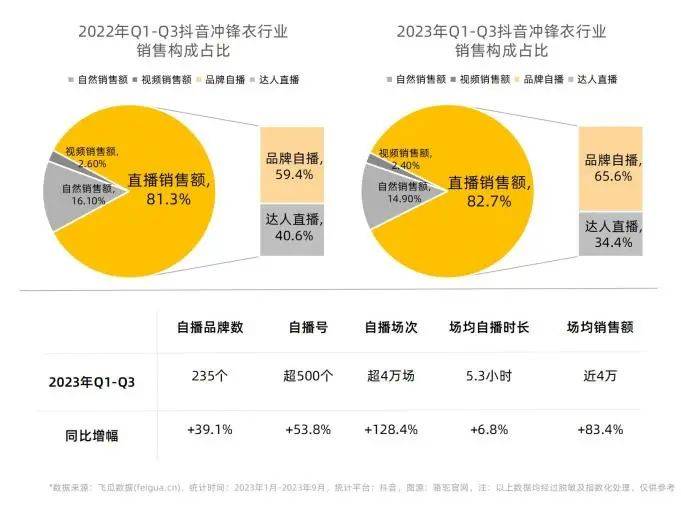 行業趨勢:抖音衝鋒衣日常銷售起量,由季節性向常態化銷售過渡;直播帶貨的銷售佔比有所提升,主要以品牌自播為主,品牌自播的場次、時長以及場均銷售額均有所提升。