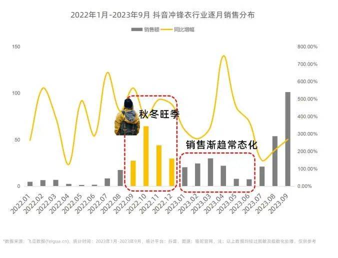 2022年1月-2023年9月,抖音電商平台衝鋒衣品類銷售趨勢中: