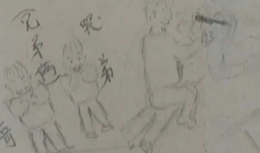畫上,媽媽在地上趴着,一個男性半蹲在媽媽身後,朝媽媽的後腦勺舉着針,另外一個男人朝媽媽舉着刀。他還畫了兩個小男孩,代表自己和弟弟,他們瞪着圓圓的眼睛,一個人無措地哭,一人大聲尖叫。