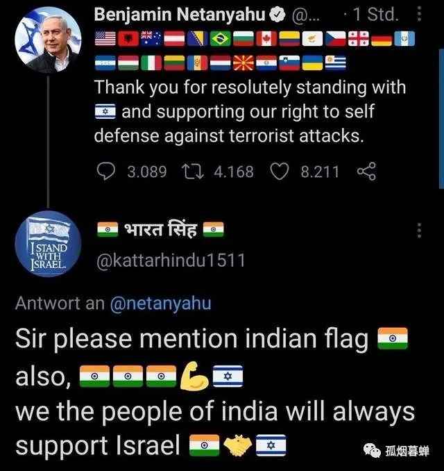 這就讓一些力挺以色列的印度網民很不爽了。其中有一位把自己的頭像改成了“我支持以色列”(I stand with Israel)的印度網民,甚至還跑到了內塔尼亞胡這條推文下面來在線懇求:“Sri,請把印度的國旗掛上吧。我們印度人會永遠支持以色列的。”