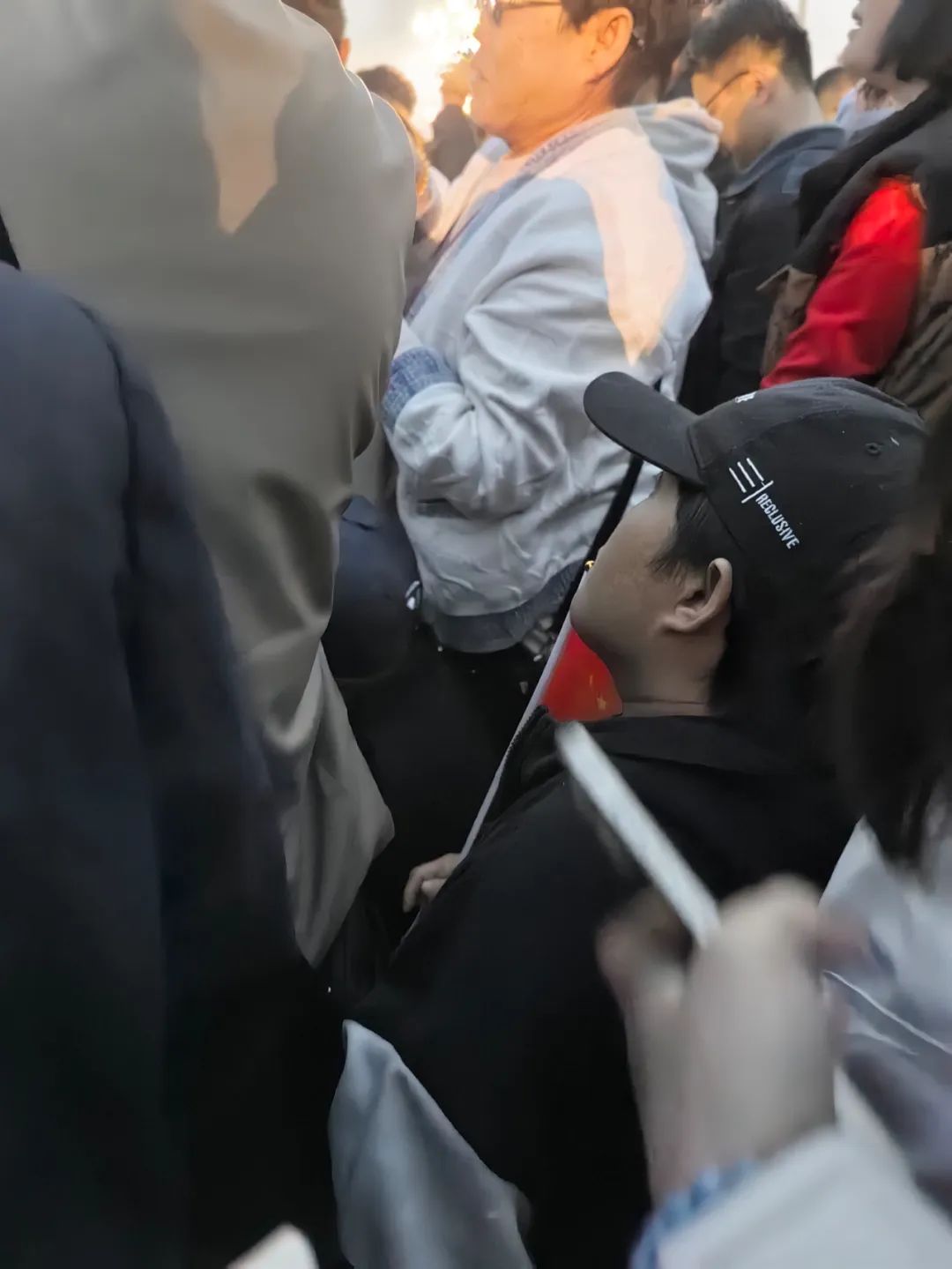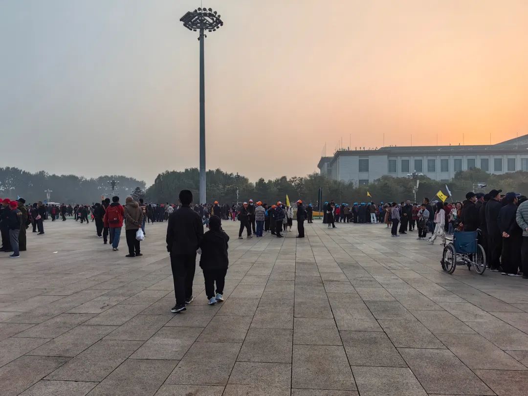 深秋寒涼,腳底的寒氣不斷上冒。六點半,儀仗隊行步升旗,人羣開始雀躍,許多人拿起手機拍升旗。李敏什麼也看不到,她和母親都仰起頭,看旁邊高個頭的人手機拍攝的升旗畫面。