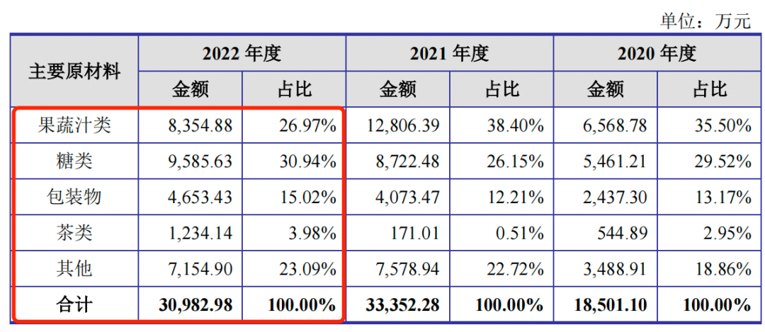 招股書顯示,德馨食品的主要原材料為果蔬汁類、糖類、茶類等。2020年,果蔬汁類、糖類和茶類的採購單價分別為11.03元/千克、4.64元/千克和35.36元/千克。