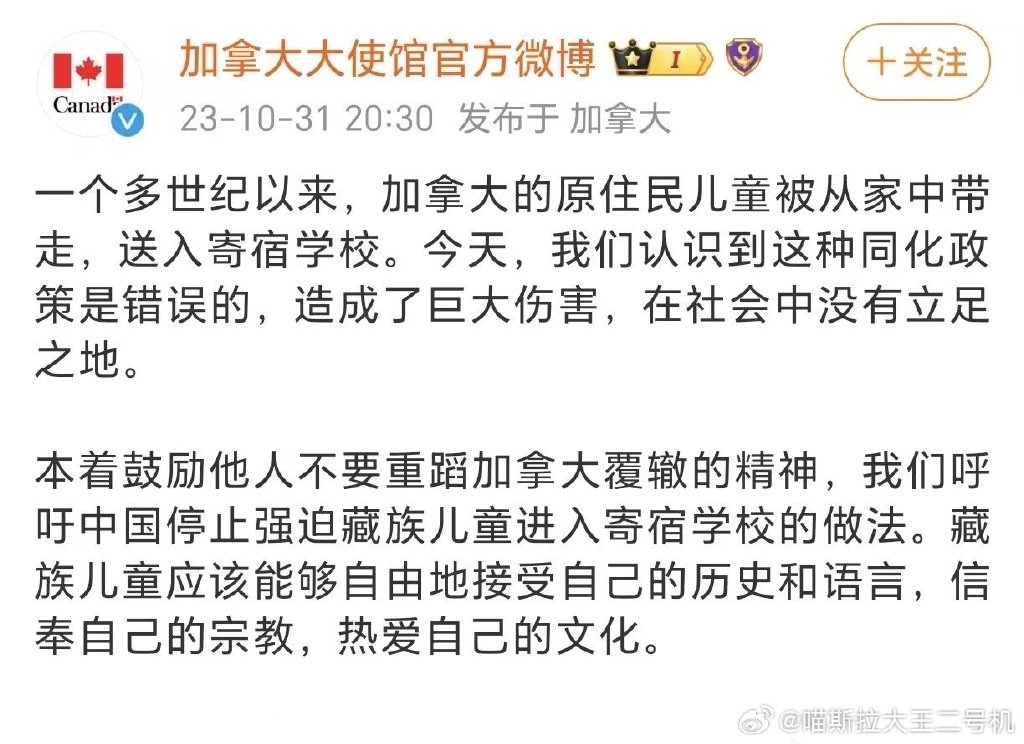 昨晚,加拿大駐華大使館微博賬號,發佈了一通極其荒唐的言論。其聲稱,加拿大原住民兒童被從家中帶走,送入寄宿學校,是錯誤的同化政策。加拿大呼籲中國停止強迫藏族兒童進入寄宿學校的做法,不要重蹈加拿大的覆轍。