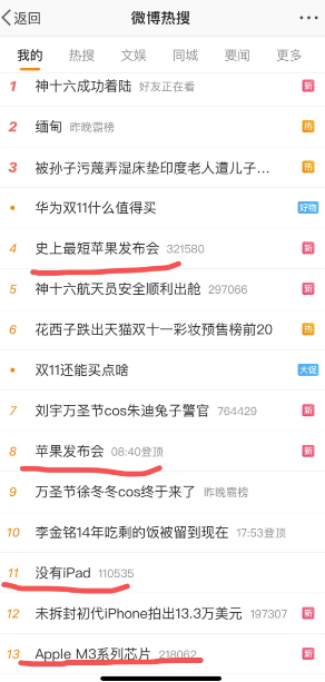 人們對蘋果發佈會的關注度仍然很高。在今晨,有關蘋果發佈會的多個詞條登上微博熱搜,包括“蘋果發佈會”“沒有iPad”“Apple M3系列芯片”。庫克早晨6點發微博預告發佈會,兩個小時就已經有500多條評論。